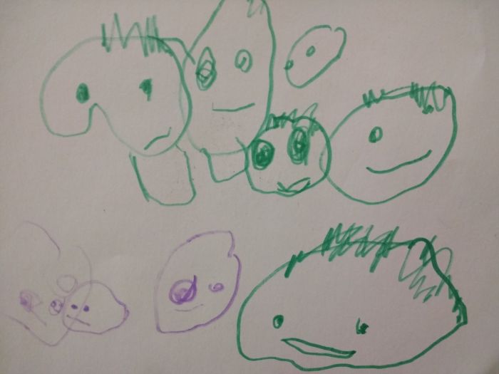 My two year old granddaughter drew this a week ago. It is her family. I expect her mother and father are the two figures in the top left because they have bodies and their size is important to her. The other two in the top tier may be her brother and herself, but who are […]